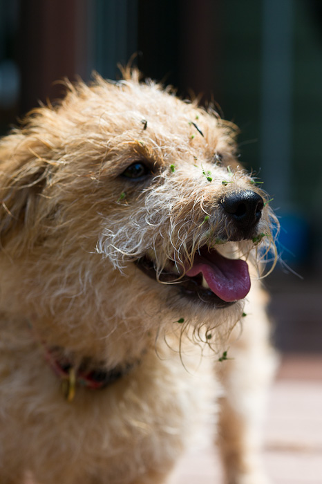 To celebrate her return home from the indignities, Peppermint took a jaunt around the backyard and reveled in destroying her perfectly coiffed hairdo. I suppose she figured if she was going to be stuck with sharp objects today, she might as well have me join in the fun—after all, who else is going to pluck the burrs and briars from her coat?