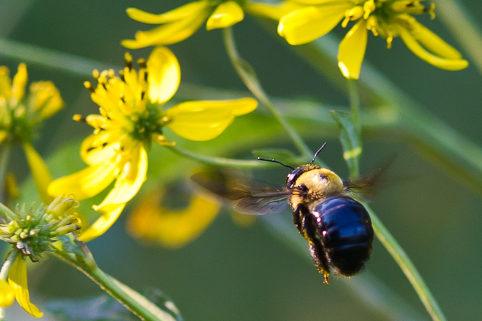 I had hoped to get some photos of the kids (and the few brave parents) during their paintball battles, but after they left base camp and disappeared into the wilderness, all we could hear were the muffled shots in the distance. So, I walked the edges of the glen and found some interesting subjects, including a patch of bright yellow flowers in full bloom hosting a vast array of buzzing insects. With fall in the air now, there’s a little more urgency in their actions, and despite the war being raged all around them, they didn’t waver from their mission.