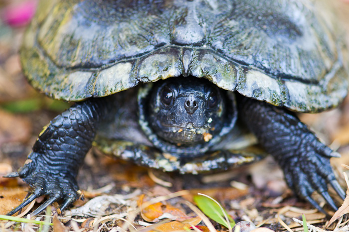 This Eastern Box turtle was a good sport. The kids netted it in the pond and brought it back to show us. They were careful to treat it gently, and carried it from house to house on their “turtle” tour. We spent a few minutes getting some close-up photos of the turtle, and while at first it was s shy, it didn’t take long for it to poke its nose out for a peek at its captors.